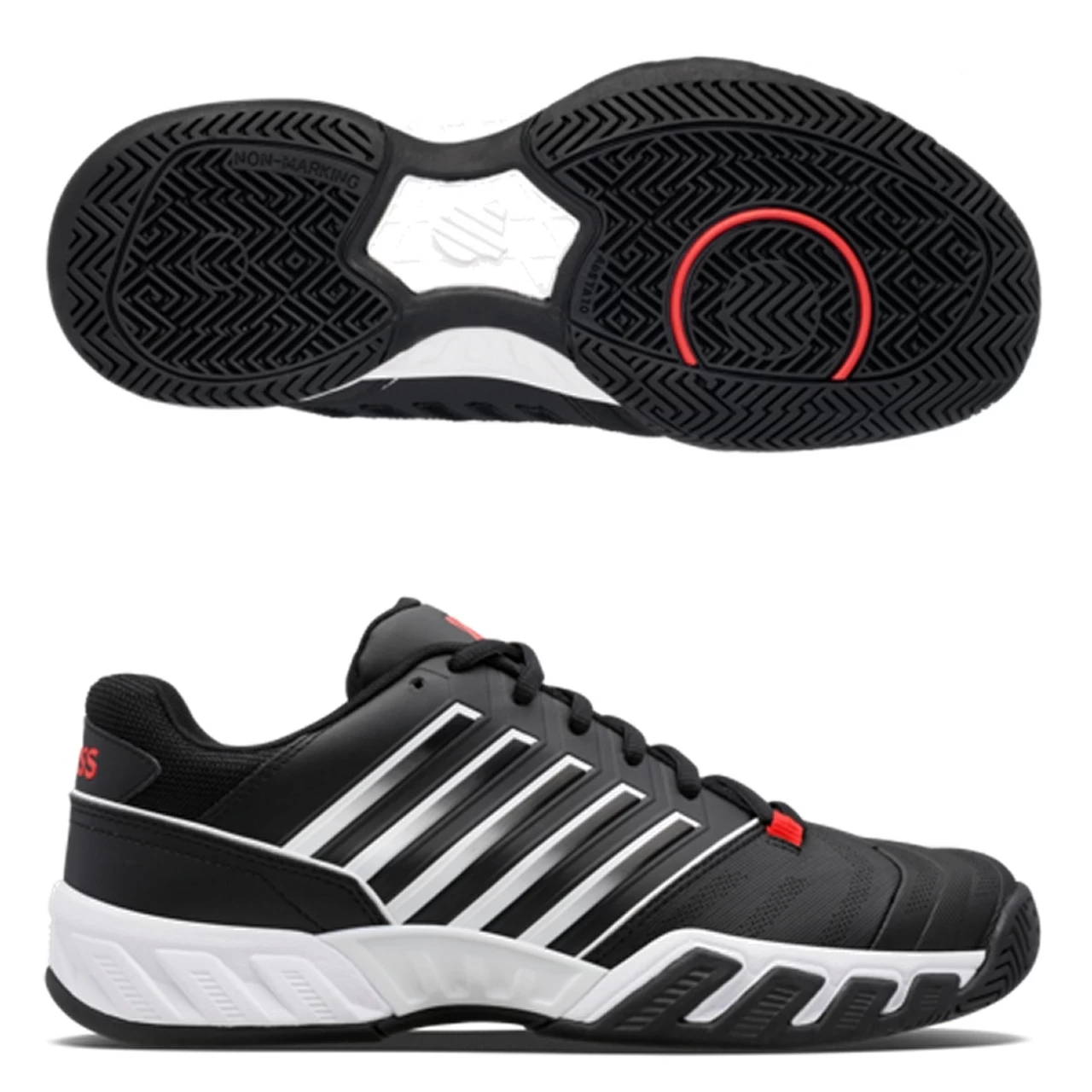 The K-Swiss Bigshot Light 4 Men’s court shoe is the latest version in the “Bigshot” line. Â This shoe combines a super stable upper with a wider forefoot and narrower heel for a custom type fit that accommodates many of our players!