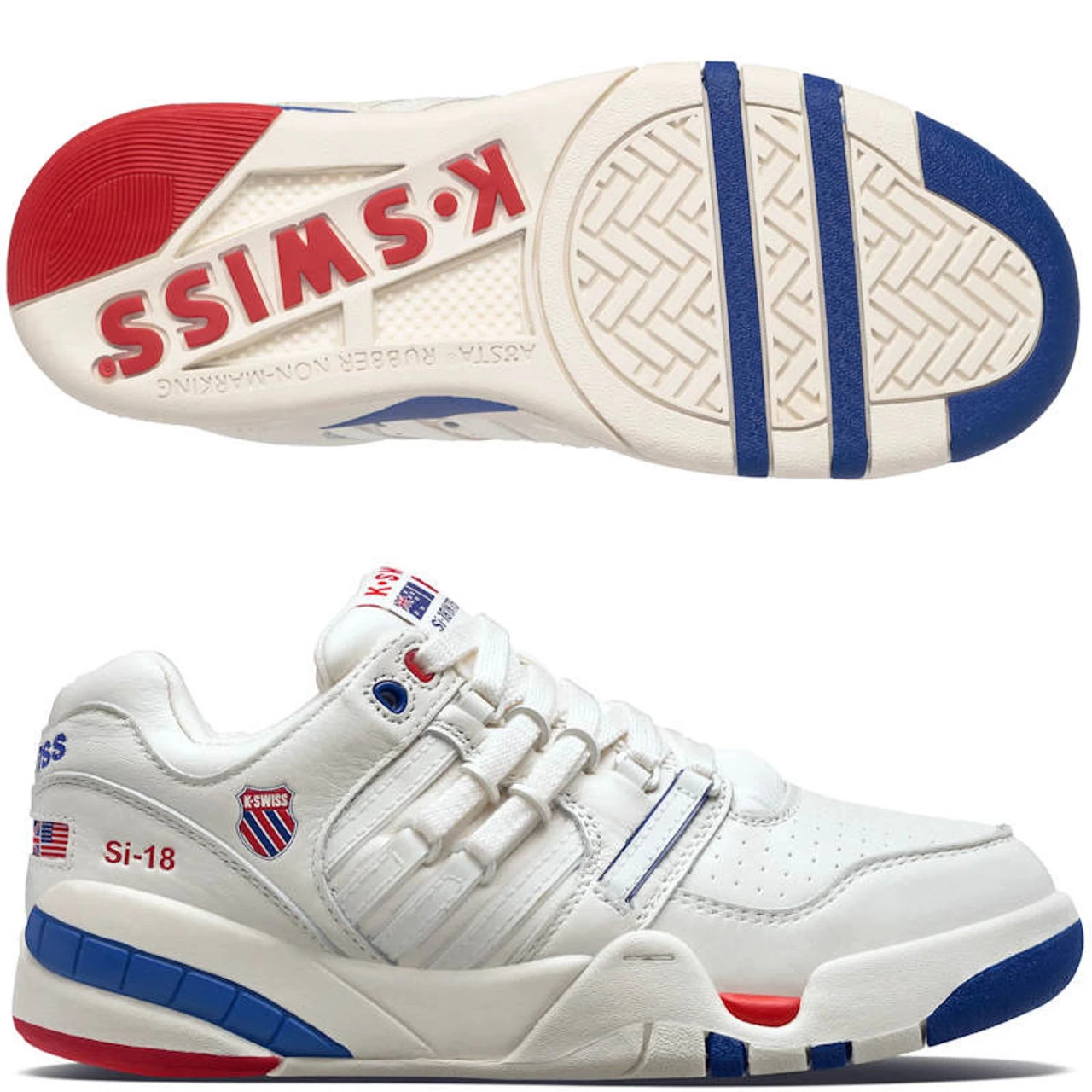 First introduced in 1989, the Si-18 International is an iconic representation of K-Swiss’ dedication to honoring athletic heritage while optimizing performance for future design. This reissue of the award-winning style combines elements of classic K-Swiss tennis, such as a premium leather upper, with innovative engineering that introduced the world to the groundbreaking Silicone Formula 18 for which the shoe is named. Flag accents adorn the heel and tongue to honor the host countries of the Grand Slam, the biggest tournament in tennis. Along with a vintage ski boot-inspired D-R Cinch lacing system and an asymmetric single-density PU midsole, the Si-18 International Heritage provides unmatched comfort and support in a timelessly recognizable silhouette.