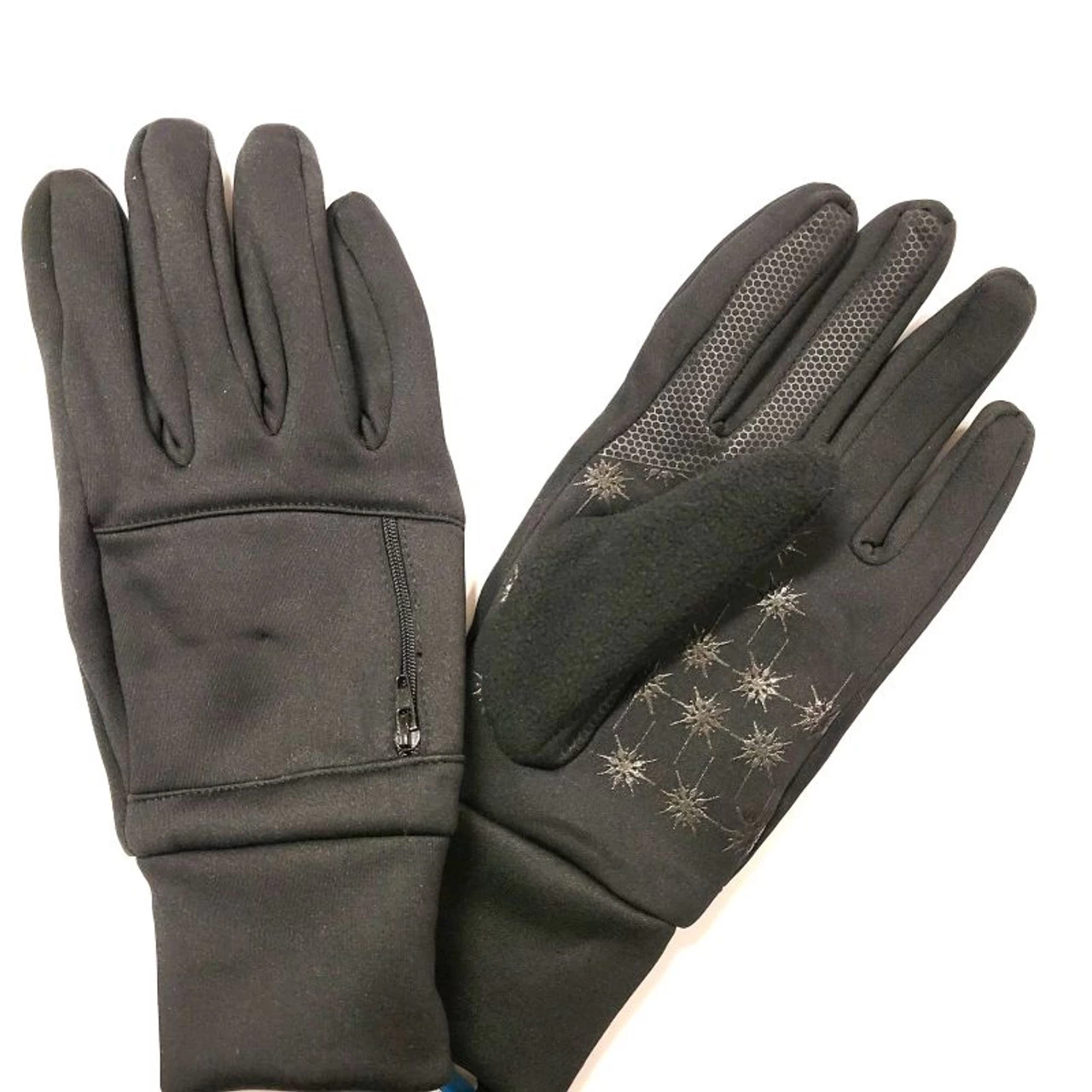 These are a medium-weight high performance glove with a longer cuff for more protection. Wind blocking construction provides a surprising amount of warmth, especially in windy conditions. Made of stretchy silky-feeling poly fabric on the exterior, fleece on the interior and with a silicone pattern on the palm for great grip on the paddle. A small zippered pocket on the glove back accomodates a hand-warmer pack, key card or tissues when most needed!