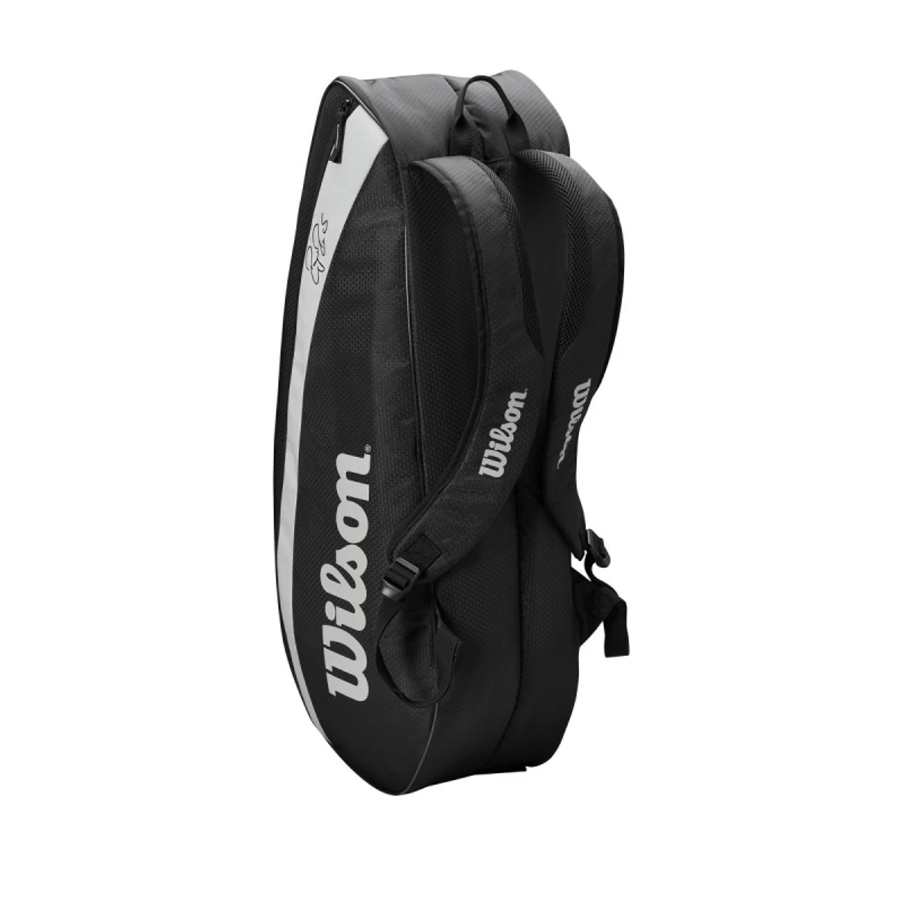 The Wilson RF Team 6 Pack racquet bag wraps clean design, useful functionality and legendary inspiration all together for fans of the tennis icon. Showcasing Roger’s revered signature on each side, this bag features two large main compartments that hold up to six rackets (total), a pair of exterior side pockets for additional personal storage space, and a new grey screen print logo.